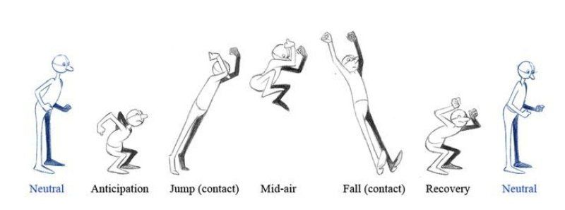 This image is a fantastic example of anticipation. The character squats down for a moment in an active position, letting the viewer know that he is going to jump. This way your brain has time to process the action before it happens, making it easier to understand what is happening.